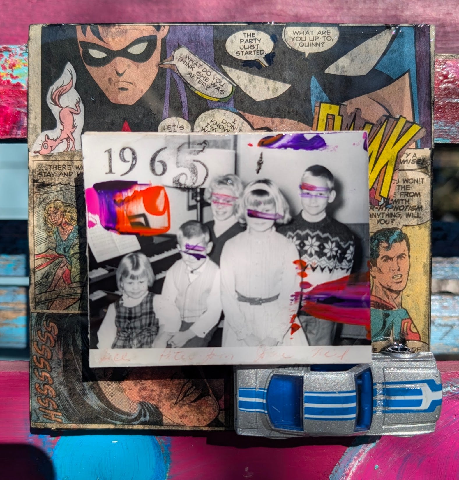 Medium: Resin, Mixed-Media Collage (1965 Photograph, Acrylic Paint, Comic Book Panels, Found Object/Toy Car)