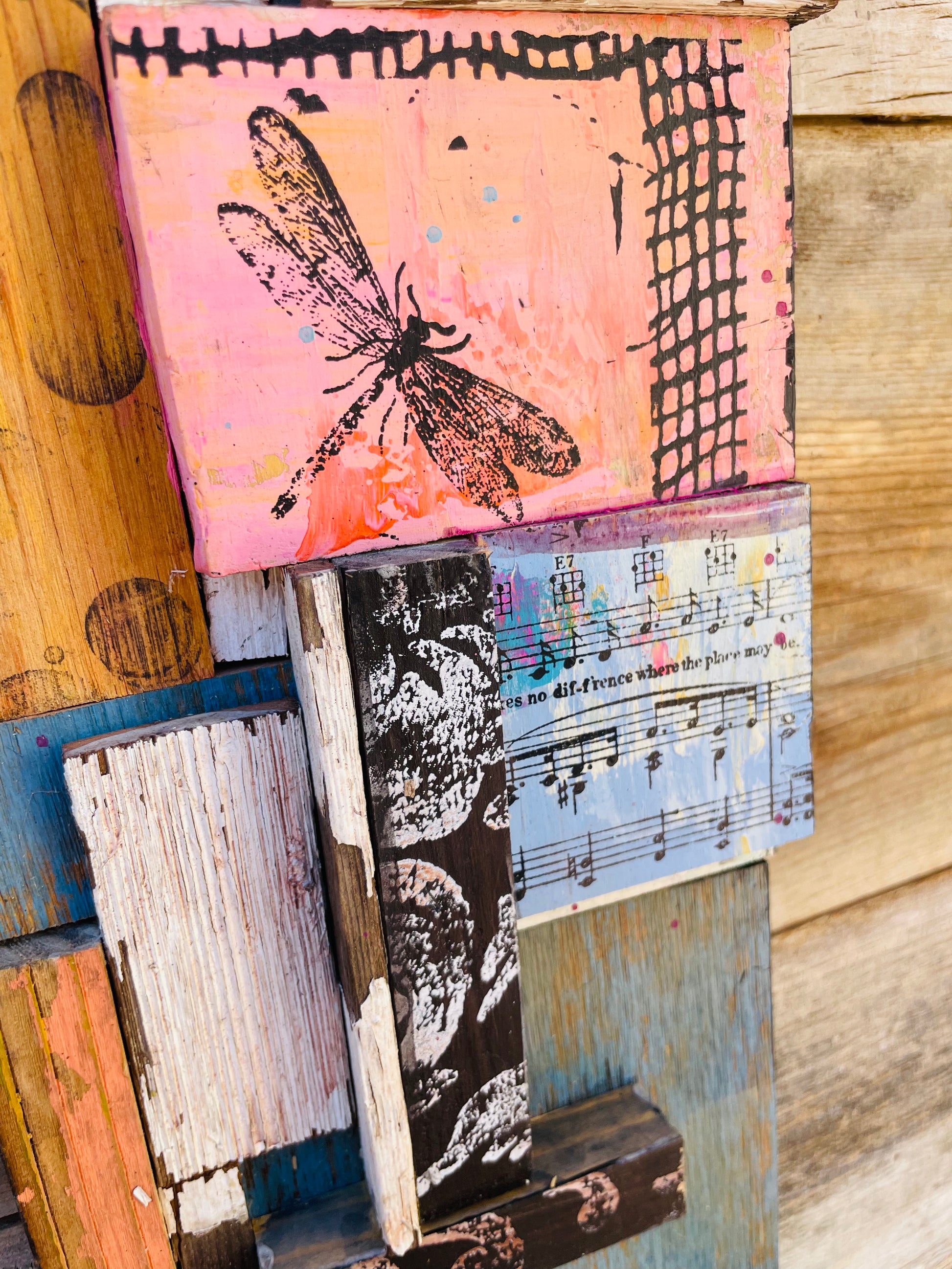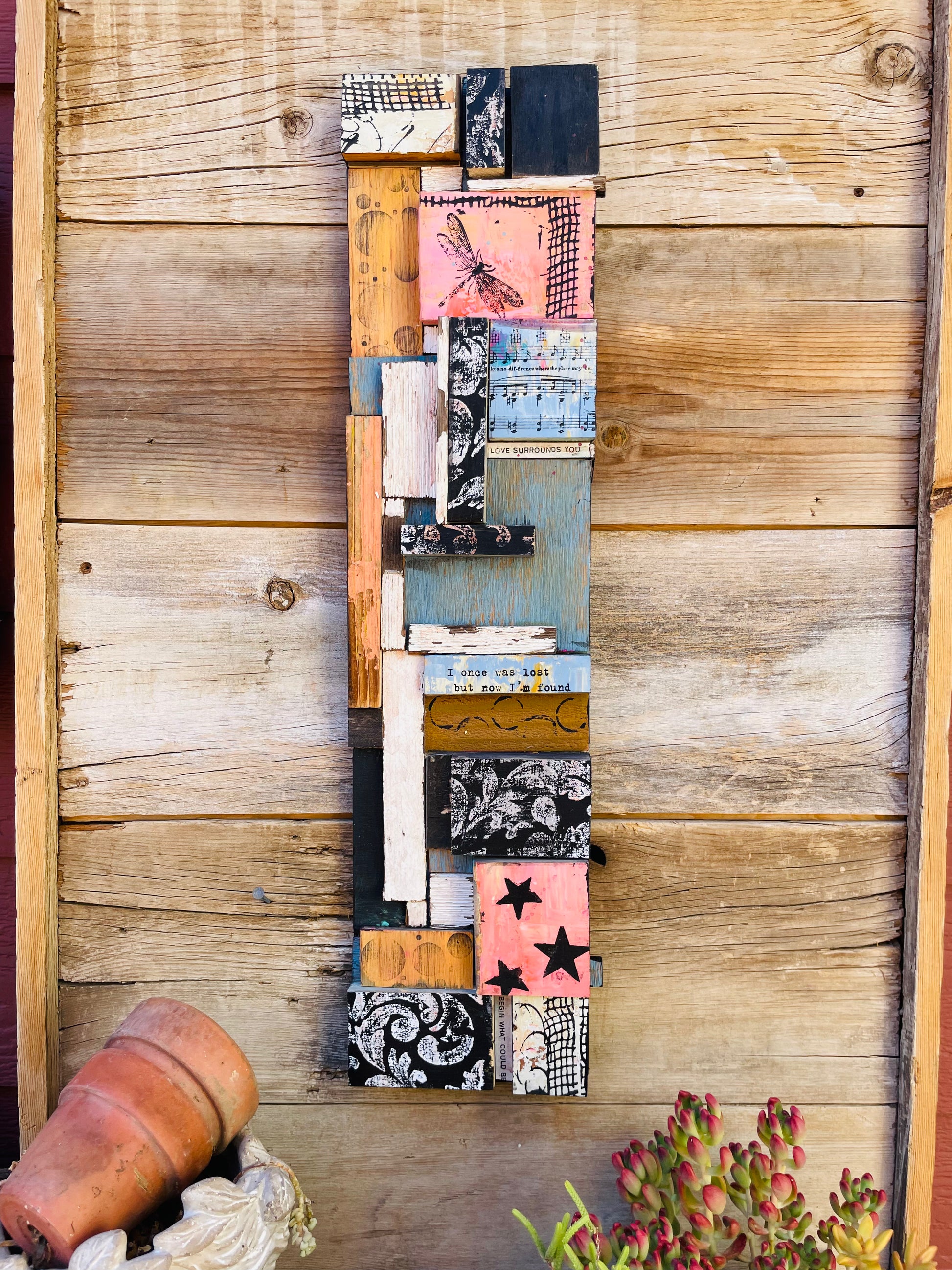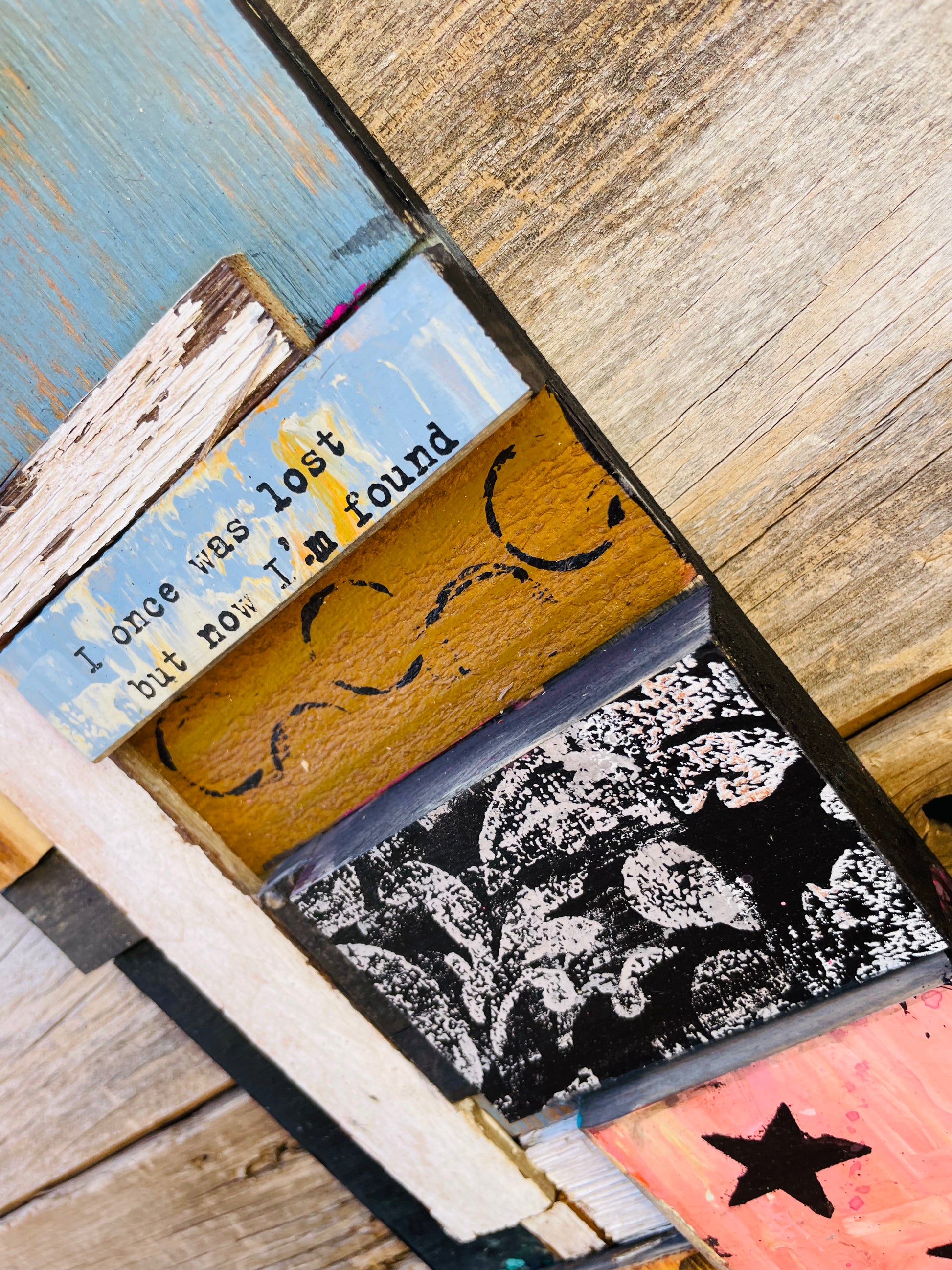 Reclaimed wood from all sorts of fun places, Colorado mountains, restoration projects, train tracks, thrift stores. Love making these mosaics ..getting lost in the play...