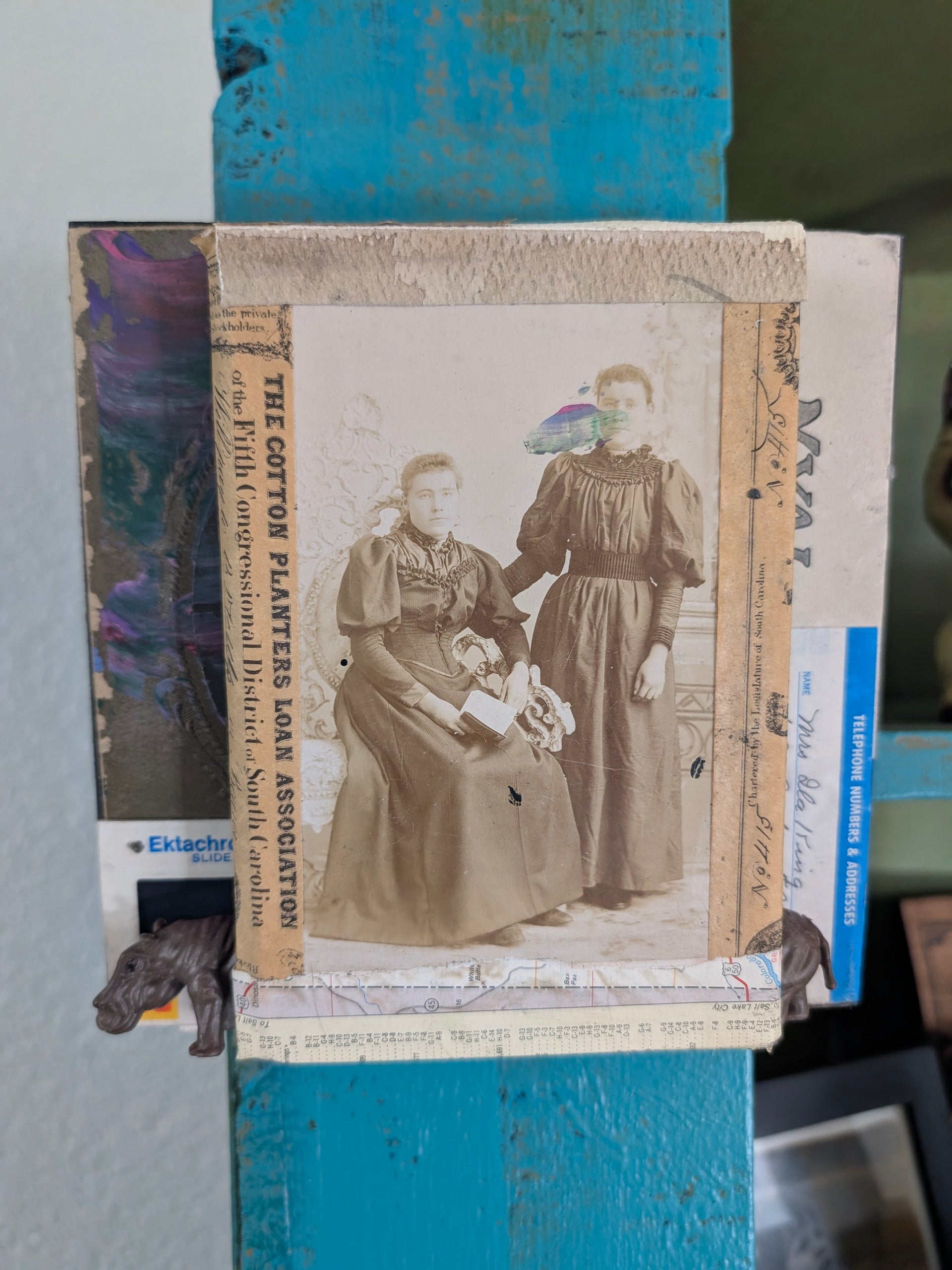 This thought-provoking mixed-media collage juxtaposes historical formality with surreal contemporary intervention. The core image is a stunning, dark-toned antique photograph featuring two formally dressed women, one seated and holding a bouquet. The surrounding collage is dense with historical context, including a vertical strip of text referencing the "Cotton Planters Loan Association" and a handwritten name, grounding the piece in a specific period and location.
