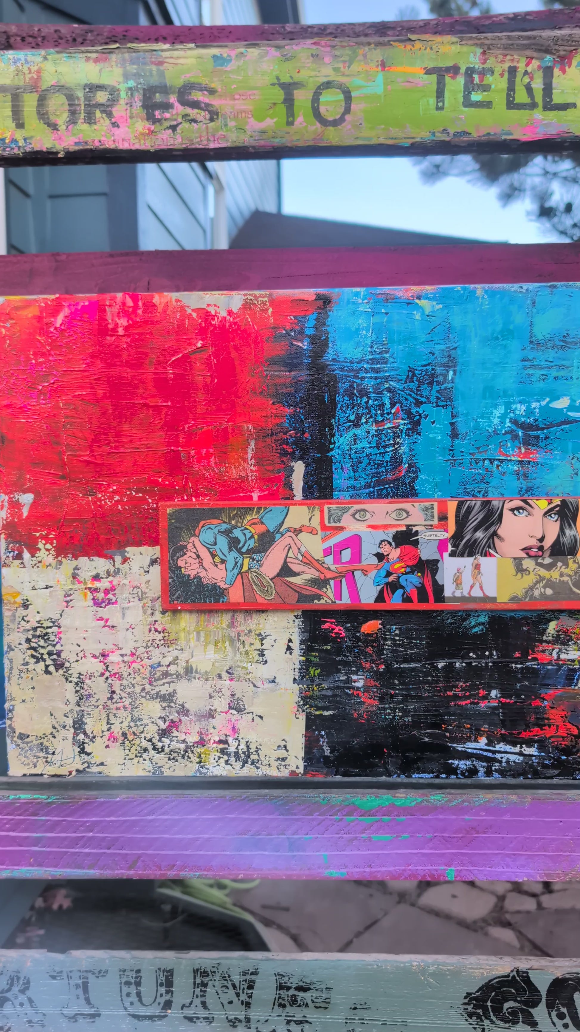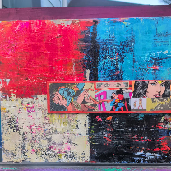 Wonder Woman and Superman landed right where warm meets cool—between bold brushstrokes and distressed textures. The narrative strips became part of the architecture, holding the whole piece together.