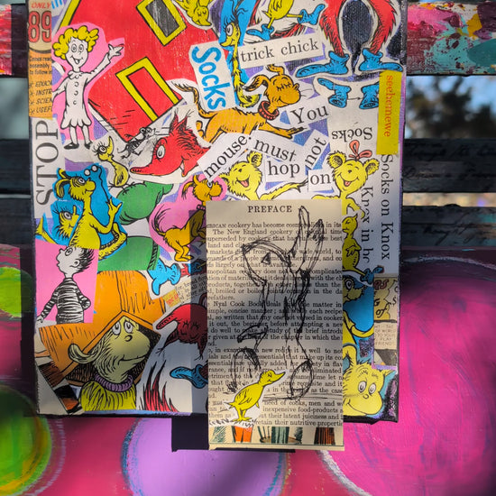 Dr. Suess collage with original bunny drawing on vintage paper.